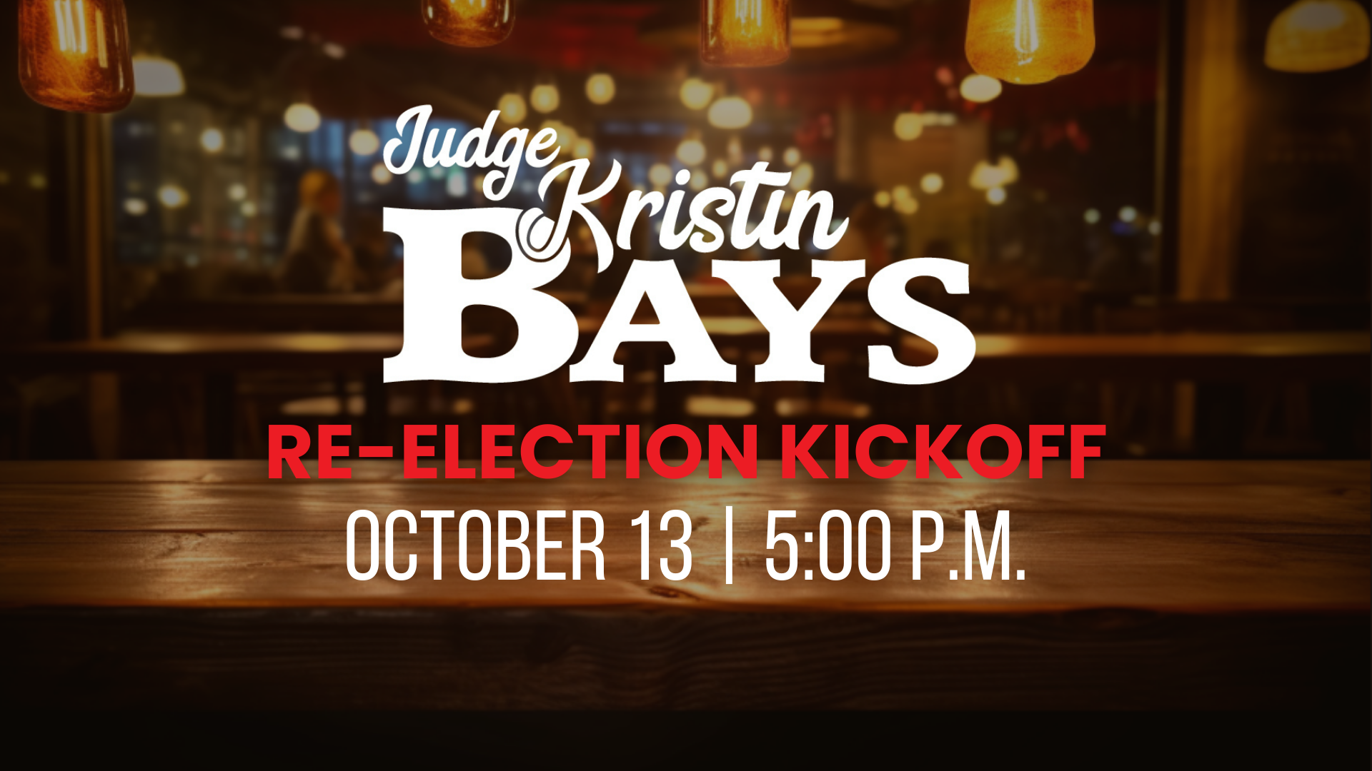 Join us on Monday, October 13th, when we will officially kick off Judge Kristin Bays’ Re-Election Campaign. Tickets are $25 and come with a full Mexican Buffet!
